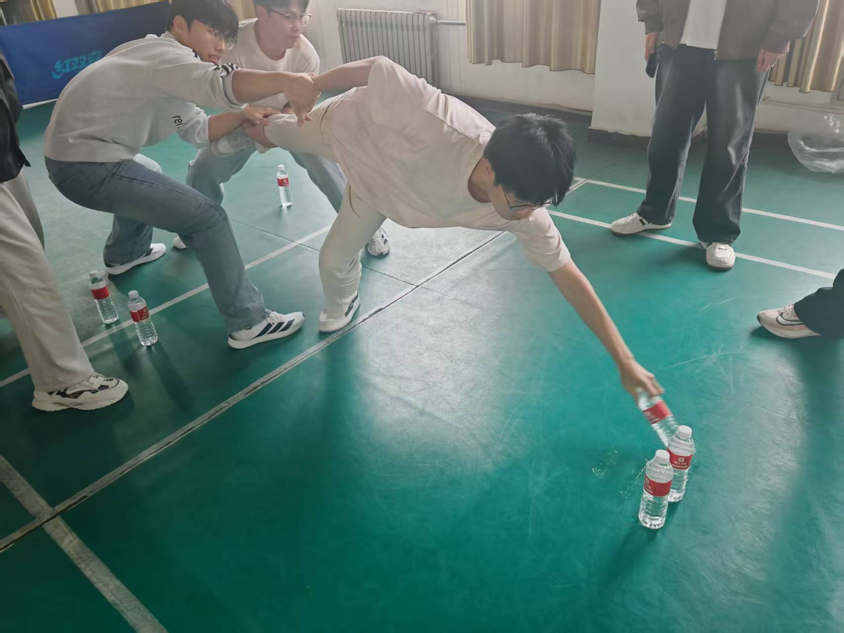 “群龙取水” 项目顺势将活动气氛推向高潮!各队成员在规定区域外紧密相依、相互支撑,搭起 “人体链条” 协作探身,在不触碰 “雷区” 的前提下精准取物。大家相拥传递力量,每一次成功取水都伴随热烈欢呼,深刻体会到团队信任与互助协的珍贵意义。